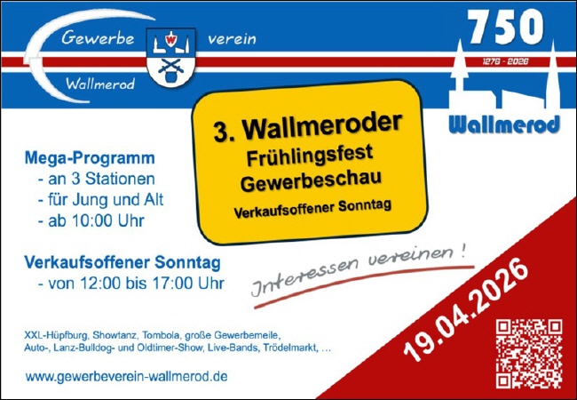 3. Frühlingsfest in Wallmerod im 750 Jahre Festjahr der Ortsgemeinde Wallmerod. Der Gewerbeverein Wallmerod e.V. plant mit Unterstützung der Ortsvereine, der Gemeinde und Verbandsgemeinde Wallmerod wieder ein Mega-Event auf die Füße zu stellen. Auf wenigstens 3 Bühnen wird Unterhaltung der besonderen Art angeboten. Es wird eine große Verlosungsaktion, XXL-Hüpfburg, Kinderschminken, Ballonbastel, Live-Bands & Showtanzgruppen, Darbietungen des Sportvereins, Lanz-Buldog- und Oltimer-Show uvm... Angeboten. Das Frühlingsfest wird in 4 Themenbereiche gegliedert: Technikstraße - Autostraße - Künstlerstraße - Vereinsmeile. In dieser stellen über 40 Gewerbebetriebe Ihre Waren und Dienstleistungen aus.