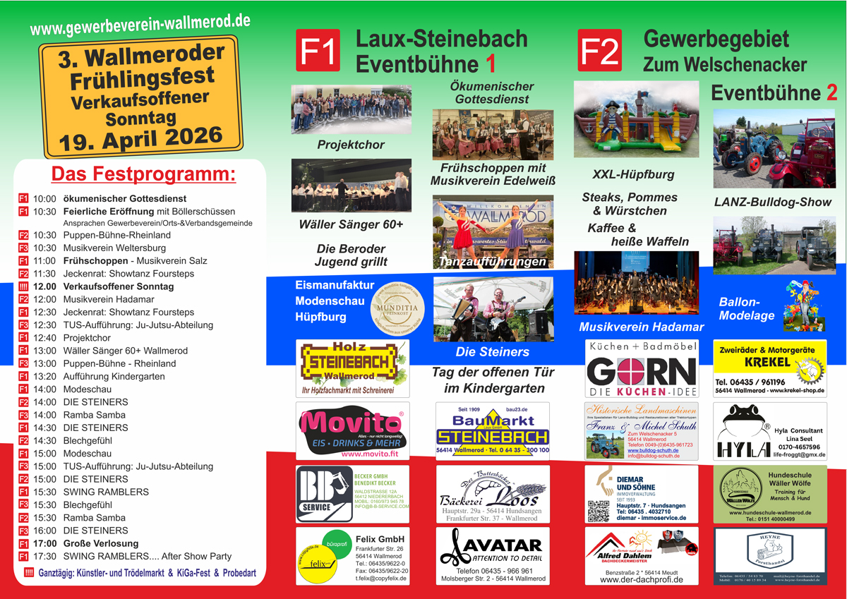 Alle Gewerbebetriebe der Ortsgemeinde Wallmerod, Verbandsgemeinde Wallmerod und umliegenden Gemeinden sind gerne eingeladen, sich für einen Stand auf dem 3. Frühlingsfest zu bewerben. Termin 19.04.2026 - Wir verteilen die Flächen nach Absprache des Orgateams.