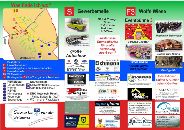 unsere Besucher auf drei Eventplätzenerwartet ein richtig großes Showprogramm, ein Trödel- und Künstlerflohmarkt und eine fast 600 Meter lange Gewerbefläche, auf der über 40 Aussteller ihre Waren und Dienstleistungen präsentieren werden. Die drei Eventplätze: 1. Steinebach/Laux 2. Gewerbegebiet „Zum Welschenacker“ 3. Wolfs-Wiese