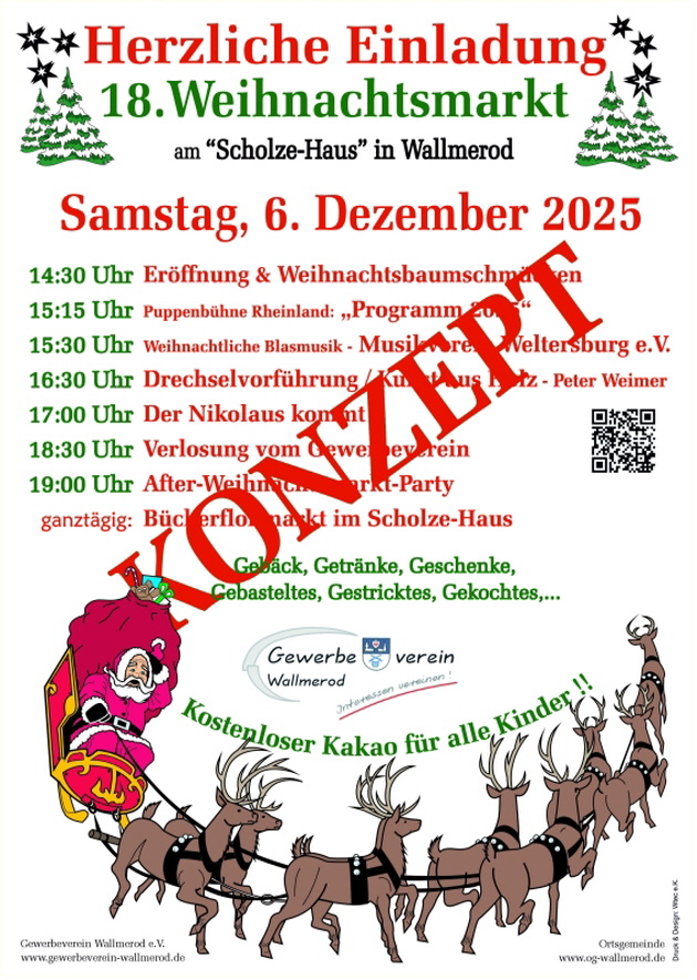 Natürlich ist für Essen und Trinken gesorgt. Heißer Roter- und Weißer Glühwein aus einer Profizapfanlage… und natürlich auch der kostenlose heiße Kakao für die Kinder und… kommt einfach vorbei. Die Ortsgemeinde und der Gewerbeverein Wallmerod freuen sich auf Ihren Besuch.