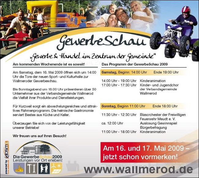 Die Verbandsgemeinde Wallmerod und die Gewerbevereine aus Hundsangen, Meudt und Wallmerod werden am 16. und 17. Mai eine gemeinsame Gewerbeschau in der neuen Kultur- und Sporthalle und auf dem angrenzendem Außengelände durchführen.