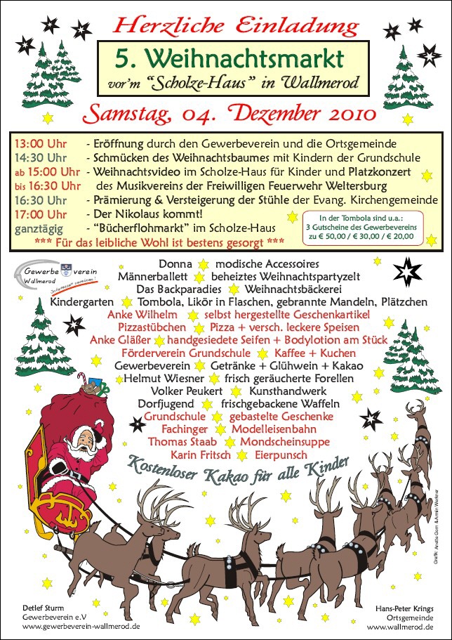 Unser diesjähriger Weihnachtsmarkt findet wieder am Samstag vor dem 2. Adventssonntag, also am 4. Dezember 2010 ab 13 Uhr statt. Dazu wurden folgende Beschlüsse gefasst: Der Gewerbeverein sponsort die Aufführung eines Musikvereins. Außerdem werden drei Gutscheine zur Verfügung gestellt, über 50, 30 und 20 Euro. Mit dem Erlös des Losverkaufs wird in diesem Jahr der Kindergarten gefördert. Es werden Werbeblätter vorbereitet und verteilt, auf denen Werbung der Mitglieder für kleines Geld berücksichtigt wird. Die Geschäftsführerin wird beauftragt, die Ankündigung des Weihnachtsmarktes im Mitteilungsblatt an prominenter Stelle zu platzieren. Gleichzeitig fordern wir hiermit alle Vereine und Gruppen auf, die am Weihnachtsmarkt teilnehmen wollen, sich beim 1. Vorsitzenden Detlef Sturm (Tel 8181) oder bei der Geschäftsführerin Barbara Krekel (Tel. 961196) oder bei jedem anderen Mitglied des Vorstandes, zwecks Vorbereitung zu melden. Natürlich werden auch wieder etliche Helfer gebraucht – bitte den Tag einplanen.