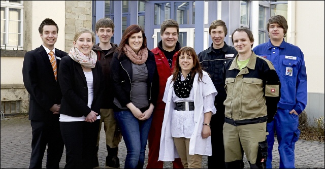 Azubis 2013 von links nach rechts: Tim Steden, Bankkaufmann im 1. Lehrjahr - Nass. Sparkasse, Anna Maria Herborn, Bankkauffrau im 1. Lehrjahr - Volksbank, Yannik Roos, Tischler im 3. Lehrjahr - Holz Steinebach, Josina Demand, Friseurin im 2. Lehrjahr - Hair und Beauty-House, Fabian Onnfryk, Fachkraft für Abwassertechnik im 1. Lehrjahr - Verbandsgemeinde, Sabina Fritzsching, pharmazeutisch/kaufmännische Assistentin im 2. Lehrjahr - Amtsapotheke, Max Kaltschmitt, KFZ-Mechatroniker im 1. Lehrjahr - Autoteile Winkler, Meik Schuth, Tischler im 1. Lehrjahr - Gorn, die Küchenidee, Jarim Haas, Fachkraft für Wasserversorgungstechnik - Verbandsgemeinde.
