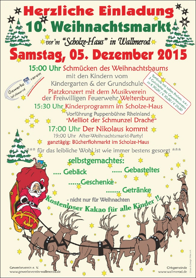 26.02.2015: Einladung zur Jahreshauptversammlung ...weiter 26.02.2015: Protokoll der Jahreshauptversammlung ...weiter 19.04.2015: Frühlingsfest in Wallmerod ...weiter Plakat "Frühlingsfest 2015" ...weiter Fotos vom 1. Wallmeroder Frühlingsfest 2015 ...weiter 05.12.2015: 10. Weihnachtsmarkt in Wallmerod ...weiter