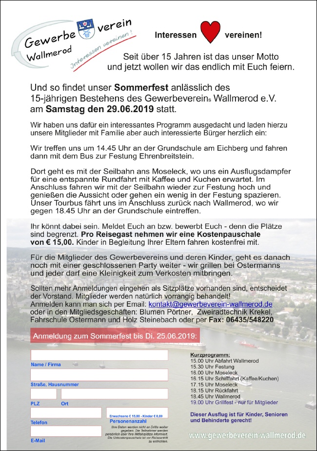 Kurzprogramm: 15.00 Uhr Abfahrt Wallmerod 15.30 Uhr Festung 16.00 Uhr Deutsches Eck 16.15 Uhr Schifffahrt (Kaffee/Kuchen) 17.15 Uhr Deutsches Eck 18.15 Uhr Rückfahrt 18.45 Uhr Wallmerod 19.00 Uhr Grillfest - nur für Mitglieder