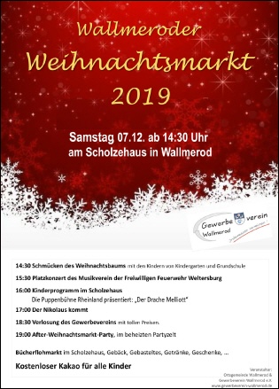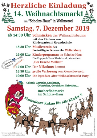 Noch mal der Termin: 14. Weihnachtsmarkt in Wallmerod - Samstag, den 07.12.2019 ab 14.30 Uhr vor dem Scholzehaus
