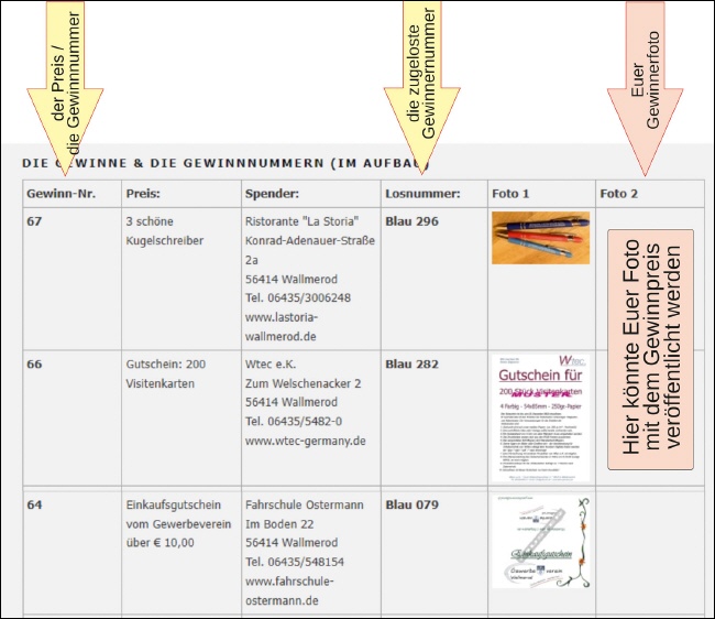 Von den Gewinnerlosen nebst Preisen wird dann ein Foto gemacht und hier veröffentlicht. Die Namen der Gewinner werden nur für die Benachrichtigung benötigt. Sie werden nicht veröffentlicht. Wer sein Foto nach der Preisübergabe veröffentlichen möchte, darf dies natürlich tun.