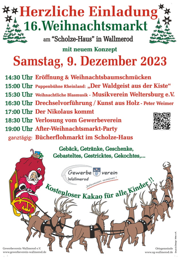 => Januar 2023: ein neues Mitglied beim Gewerbeverein ...weiter => Jahreshaupversammlung Einladung für den 21.04.2023 ...weiter => 09.12.2023: 16. Weihnachtsmarkt in Wallmerod ...weiter => Anmeldeformular für Ständler auf dem Weihnachtsmarkt ...weiter => Losverkauf für die Weihnachtstombola ...weiter